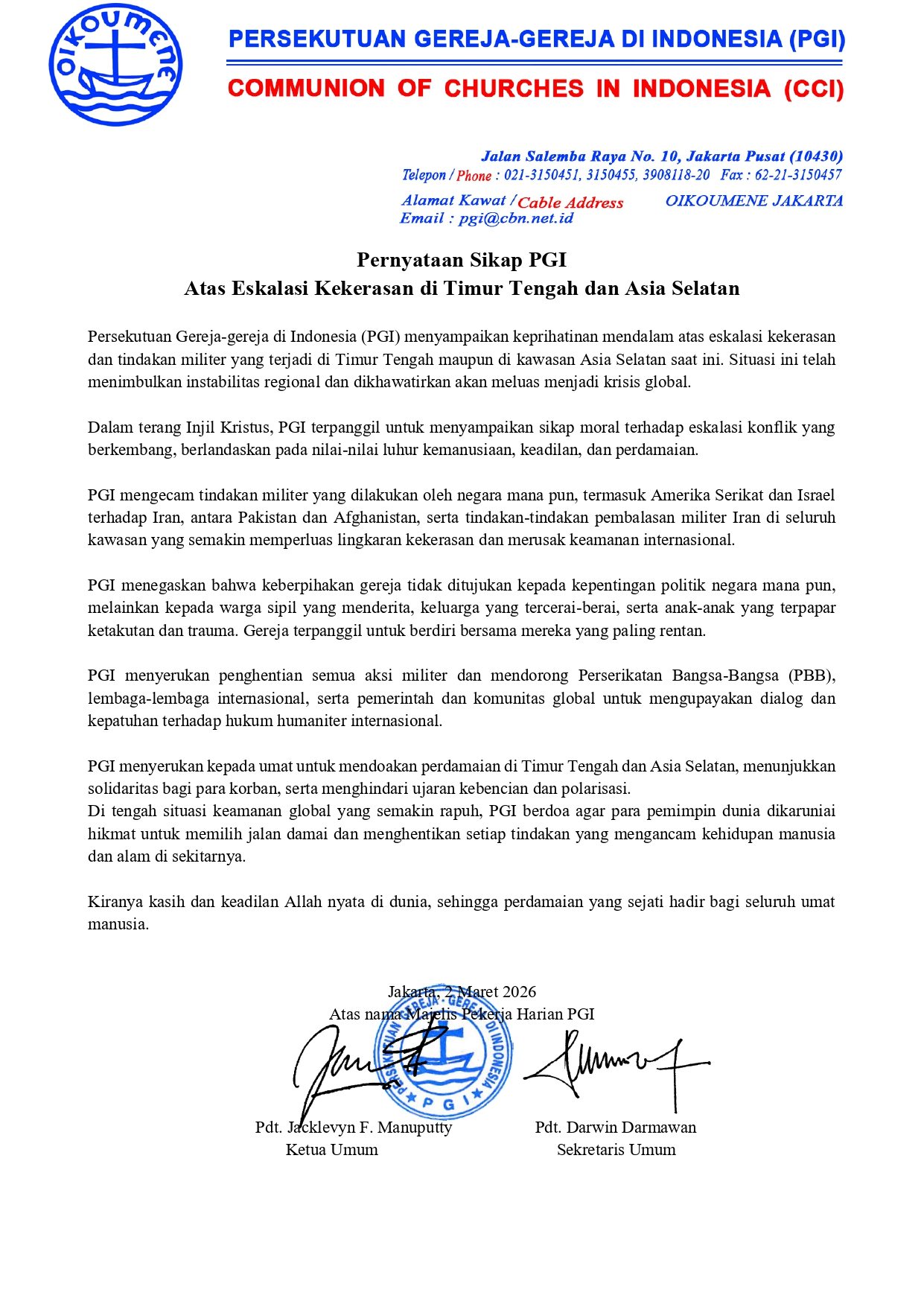 Secara tegas, PGI mengecam berbagai tindakan militer yang terjadi di kawasan Timur Tengah maupun Asia Selatan. Termasuk di dalamnya aksi militer yang melibatkan Amerika Serikat dan Israel terhadap Iran, konflik antara Pakistan dan Afghanistan, serta tindakan balasan militer Iran yang dinilai memperluas lingkaran kekerasan.